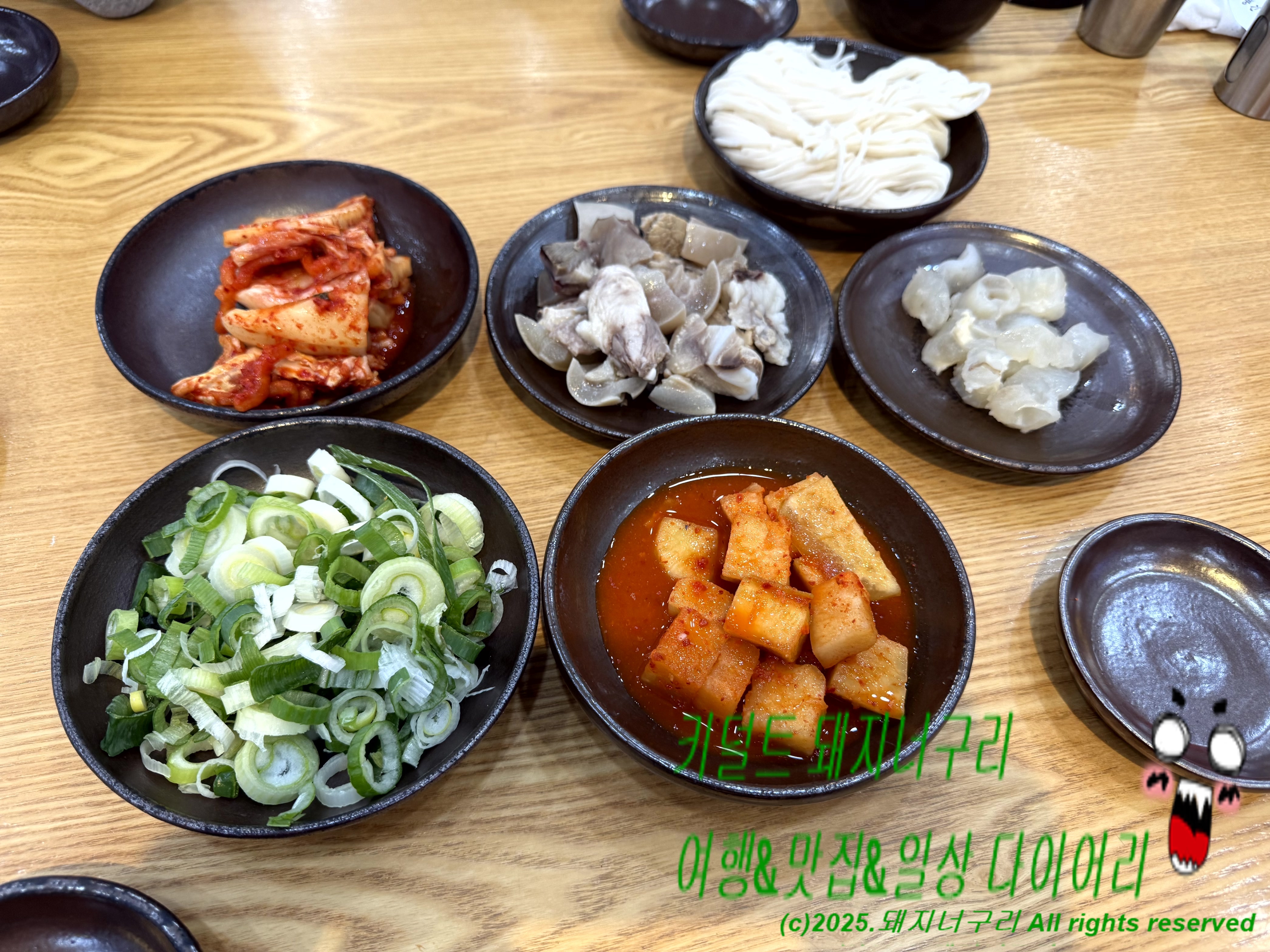 기본 찬은 김치, 깍두기, 소면, 썰은 파송송, 그리고 맛보기 수육 한접시와 흰 도가니(??) 한접시